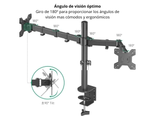 Mayor flexibilidad de visualización: el soporte de monitor de movimiento completo cuenta con inclinación de +/-85°, giro de +/-90° y rotación de 360° para orientación horizontal o vertical.