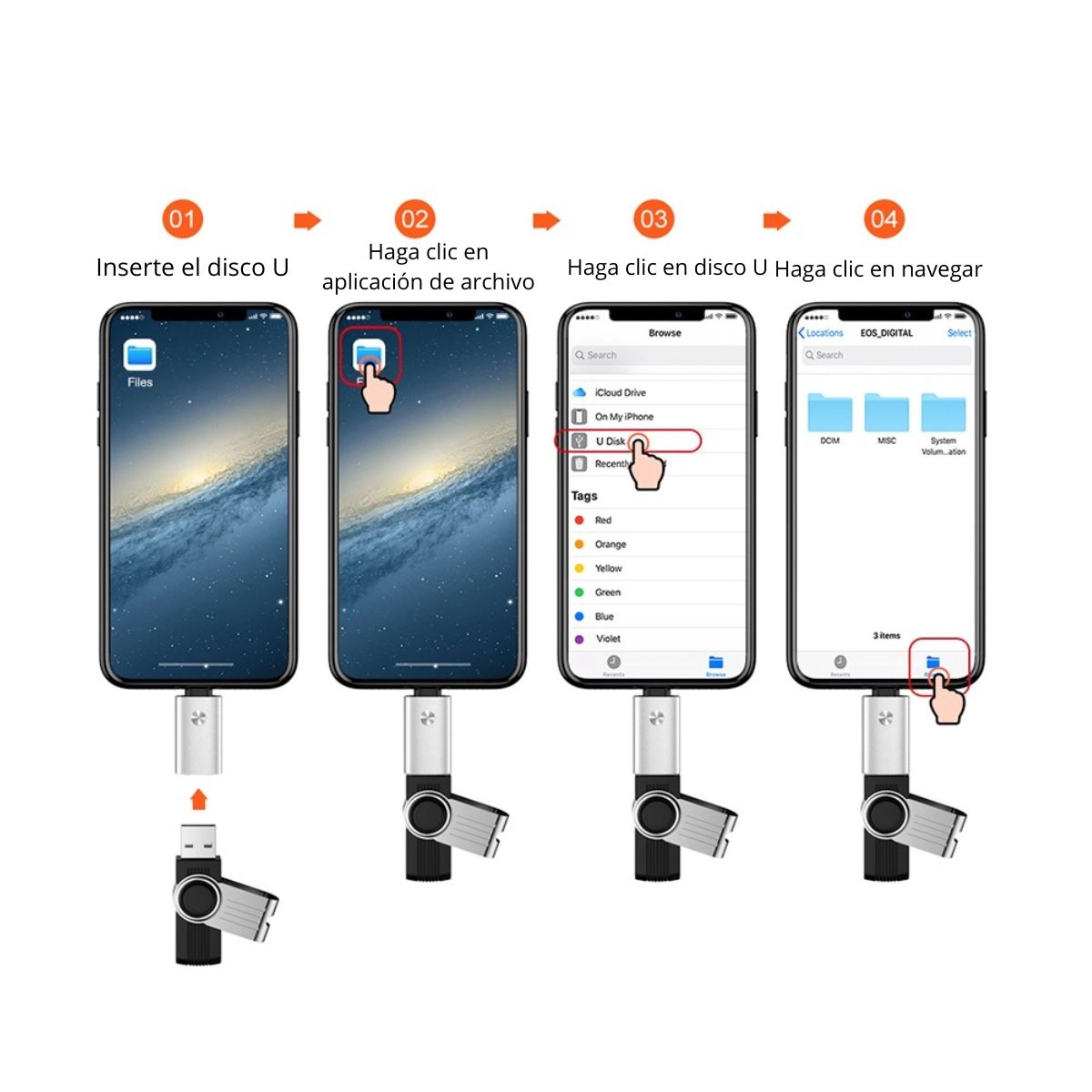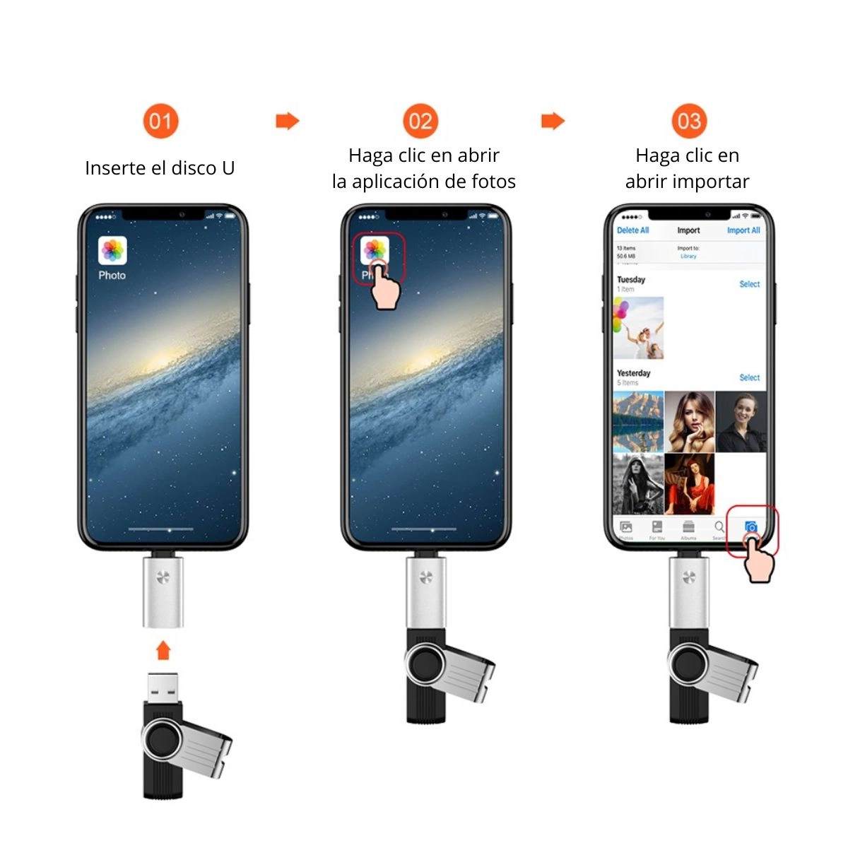 Transfiere fotos, vídeos y archivos desde iPhone/iPad a una unidad USB.