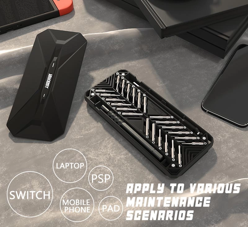 Incluye: 48 puntas, destornilladores, eje flexible y estuche de transporte compacto para mantenerlos ordenados.