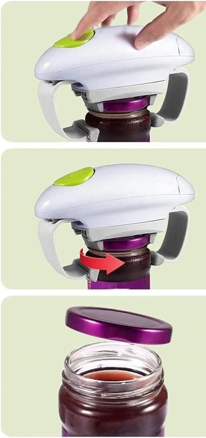 Fácil de Usar: Colóquelo en la tapa, presione el botón ligeramente y luego comenzará a funcionar, solo presione una vez más para apagarlo. El abridor de tarros solo necesita utilizar 2 pilas AA. (No incluye batería)