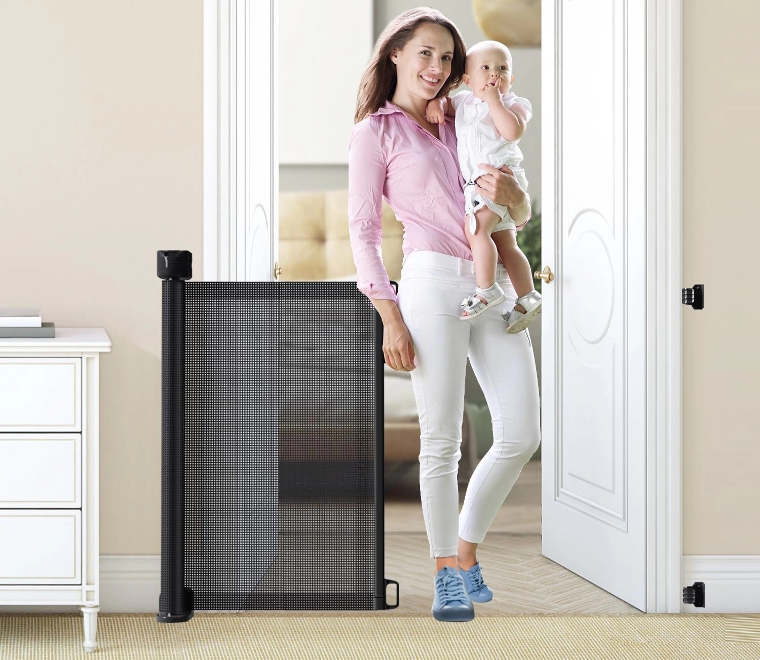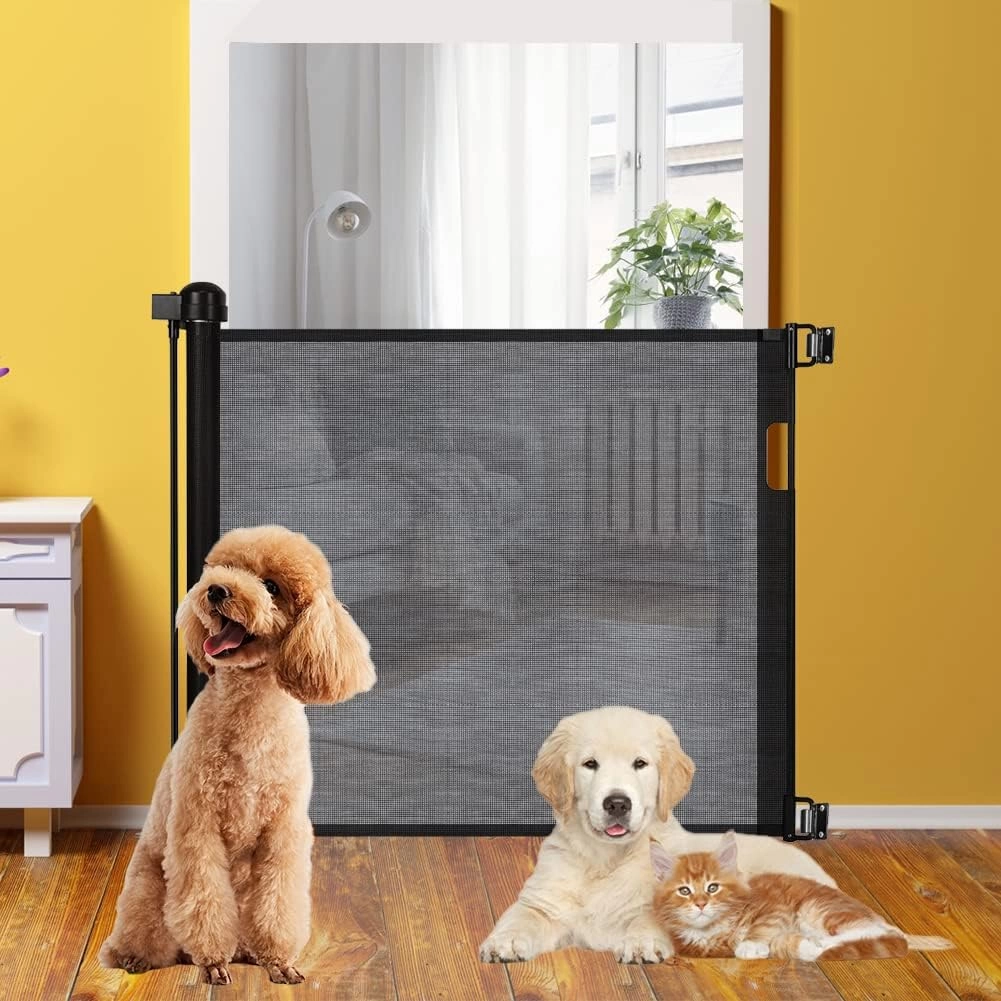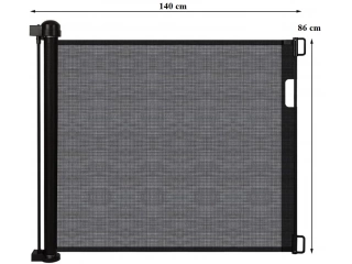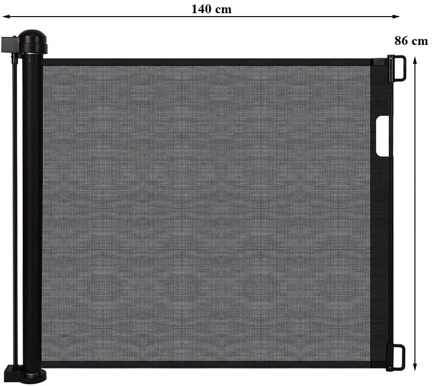 Diseño Retráctil y Ajustable: Con capacidad para extenderse hasta 150 cm de ancho y 86 cm de alto, esta puerta de seguridad extra ancha se ajusta fácilmente al ancho de su puerta o escalera. Cuando no está en uso, la malla se puede retraer completamente, ahorrando espacio y ofreciendo una mayor comodidad.