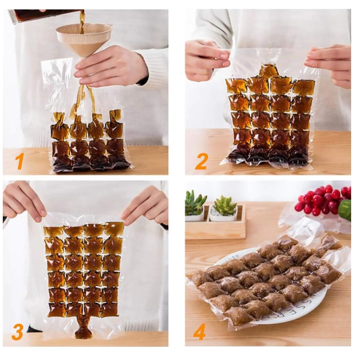 Cuenta con un diseño innovador que incluye una válvula auto sellante para evitar que el líquido se escape de la bolsa y para prevenir que los cubitos de hielo absorban olores indeseados del congelador. Además, estas bolsas se pueden apilar fácilmente en el refrigerador sin pegarse entre sí.