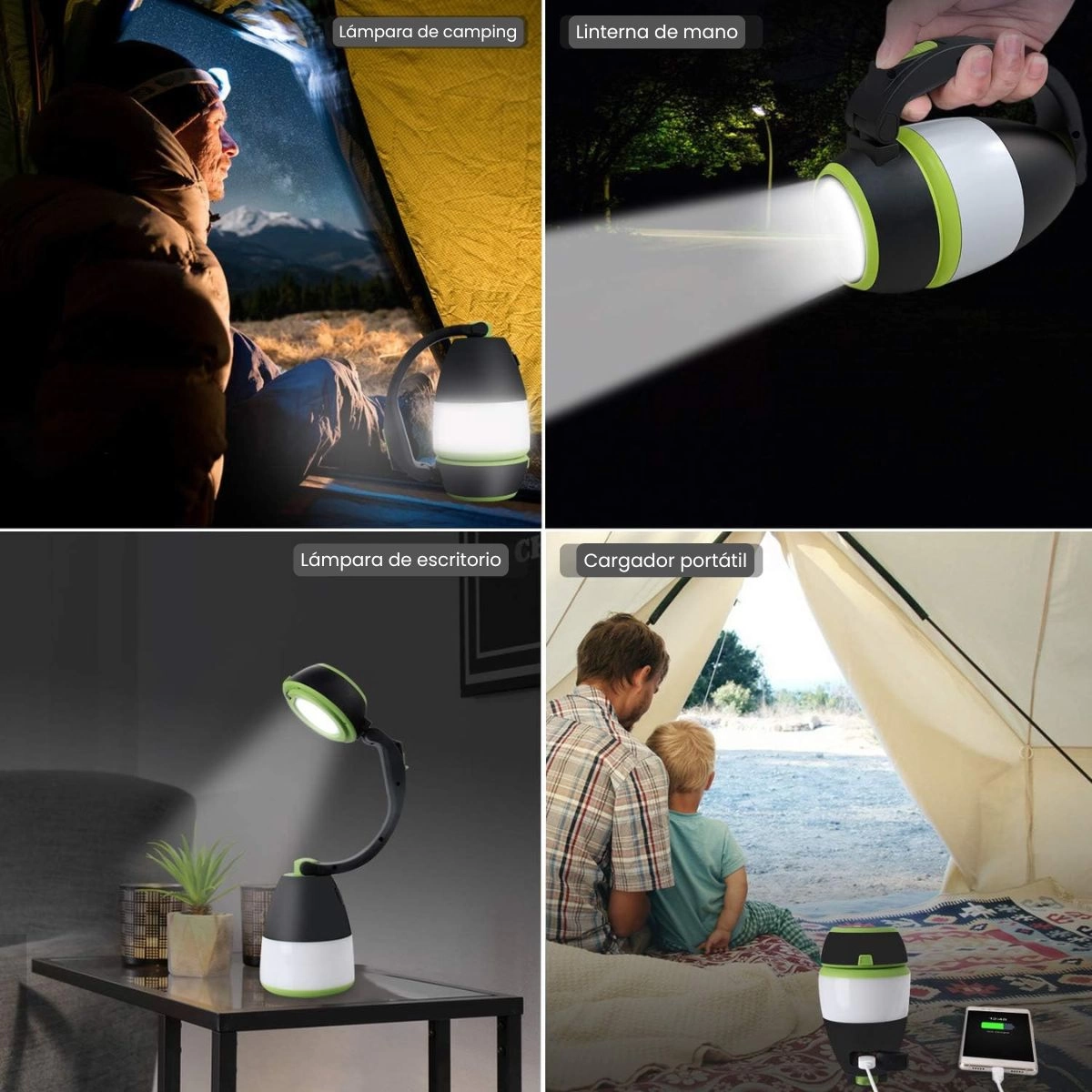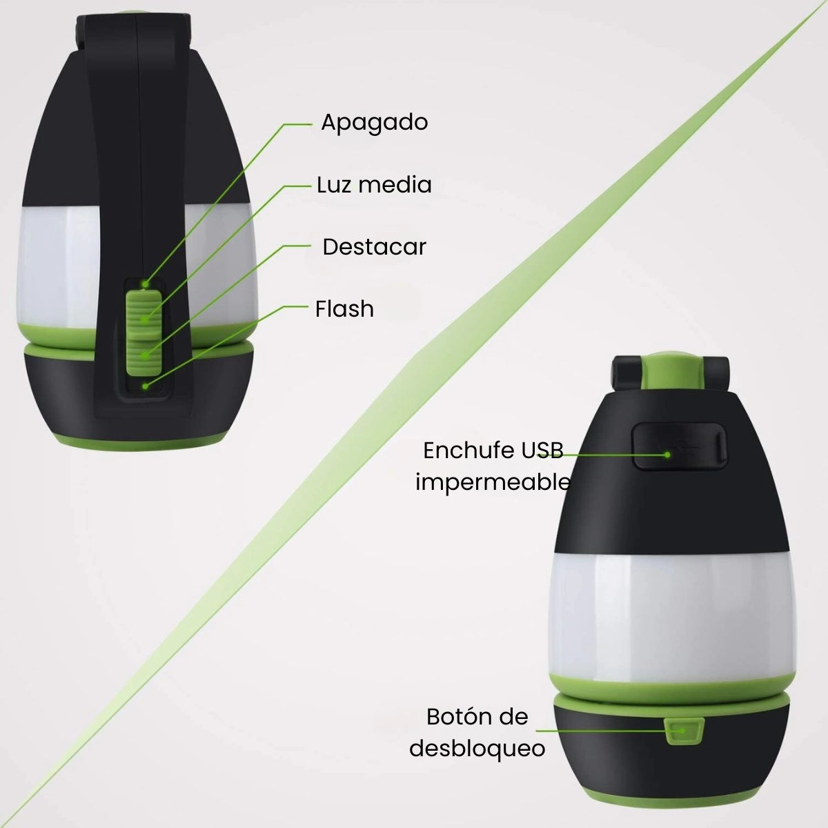 Estructura de Alta Calidad: La carcasa y el mango están fabricados en ABS de alta calidad, suave al tacto y duradero. La pantalla de policarbonato ofrece una excelente transmisión de luz, y el ángulo de iluminación de la lámpara de camping es de 360 grados, mientras que el ángulo de las luces de lectura es ajustable hasta 180 grados.