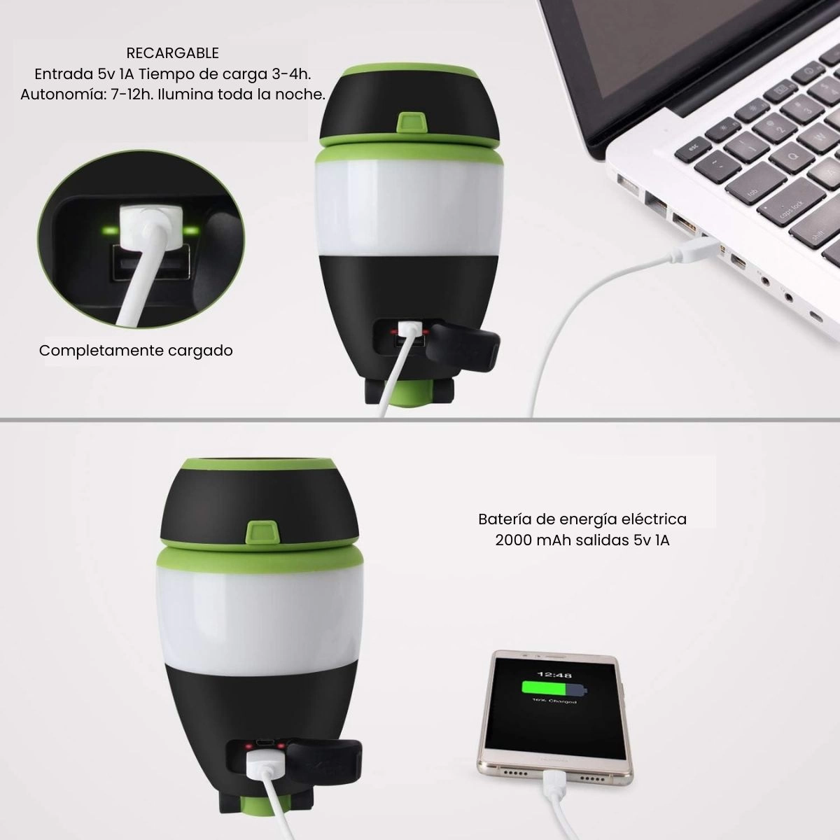 Recargable y Banco de Energía: Equipada con una batería recargable de 2000 mAh, esta luz LED se carga fácilmente mediante un puerto USB. Además, puede funcionar como un banco de energía para cargar tu teléfono u otros dispositivos móviles en caso de emergencia.