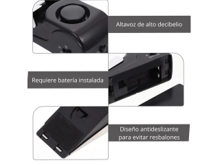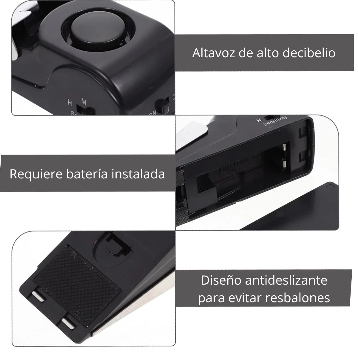 Si la puerta asegurada está abierta, el borde de la puerta presionará hacia abajo la placa de cuña de la alarma de la puerta del tope y activará la alarma. La cual sonará a 120dB de sirena de manera continua.