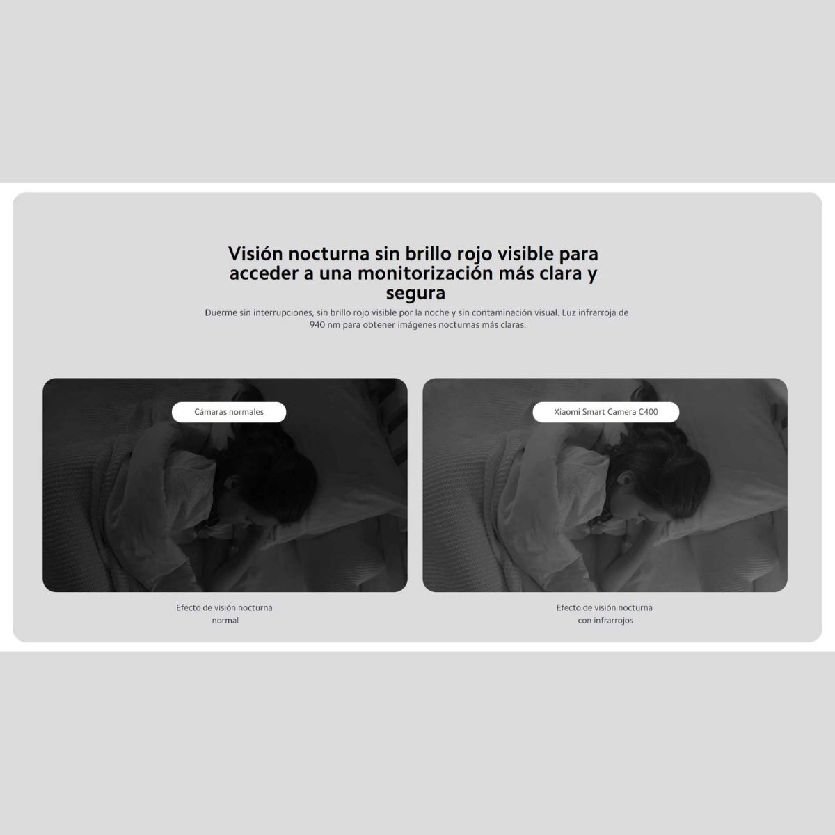 Duerme sin interrupciones, sin brillo rojo visible por la noche y sin contaminación visual. Luz infrarroja de 940 nm para imágenes nocturnas más claras.