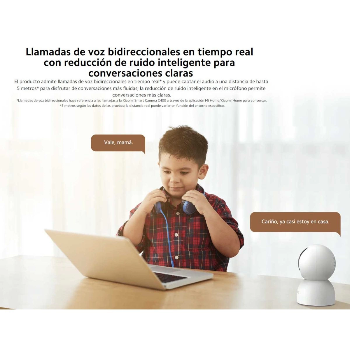 Llamadas de voz bidireccionales en tiempo real con reducción de ruido inteligente habilitada para conversaciones claras. El producto admite llamadas de voz bidireccionales en tiempo real* y puede captar audio a una distancia de hasta 5 metros* para conversaciones telefónicas más fluidas; La reducción de ruido inteligente está habilitada para el micrófono para conversaciones más claras.