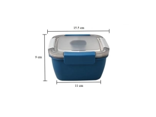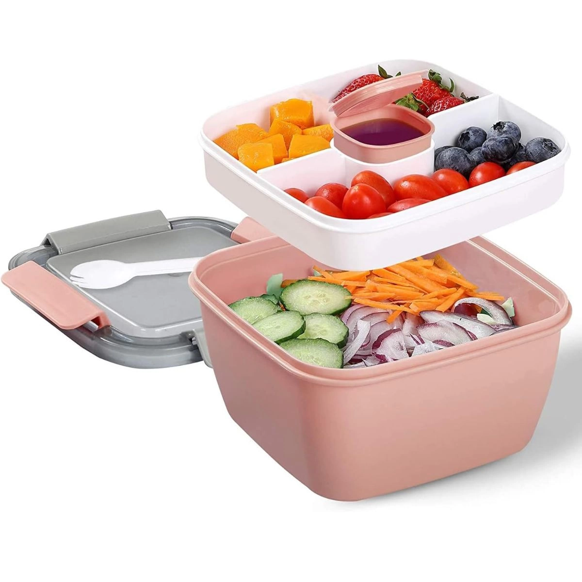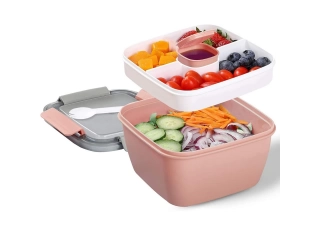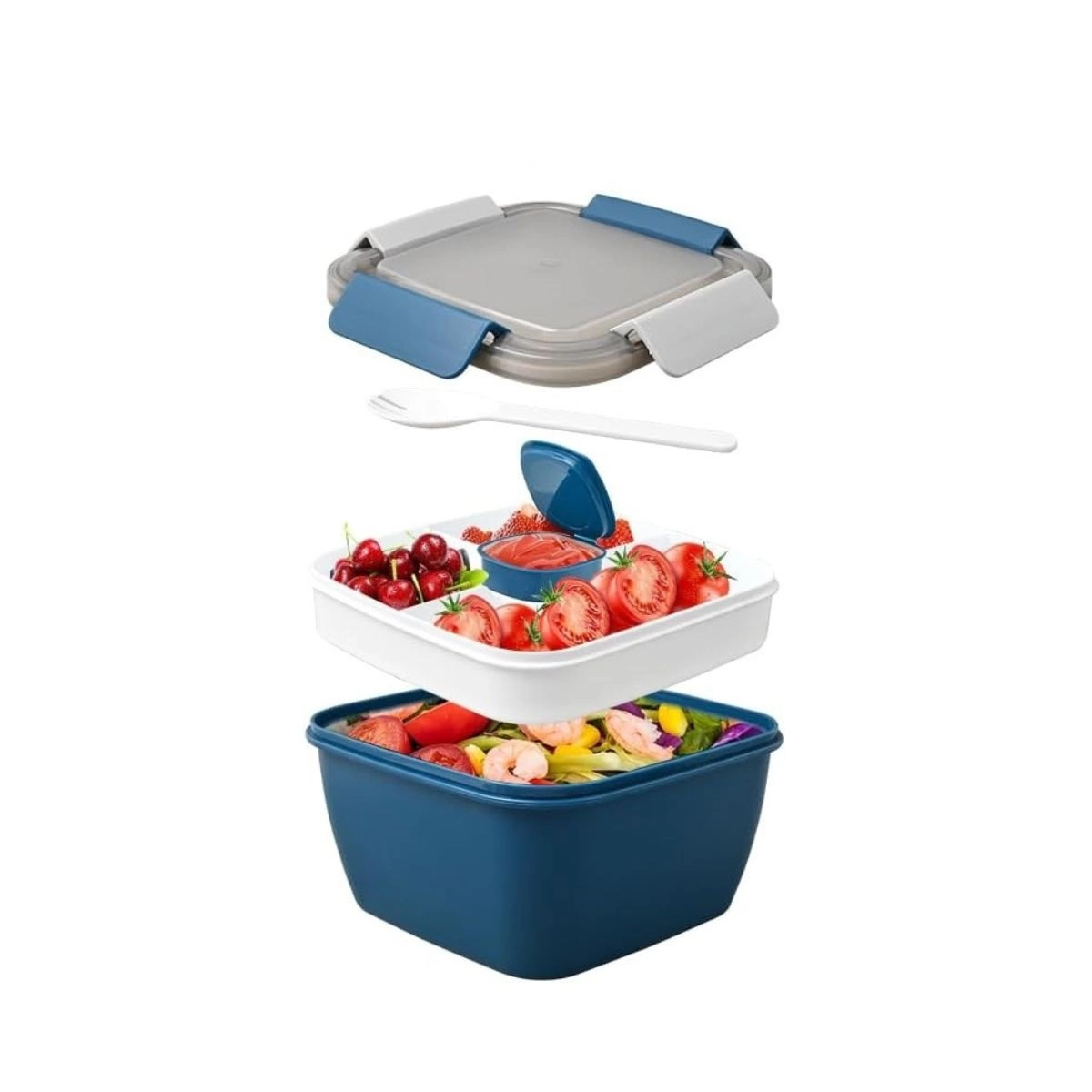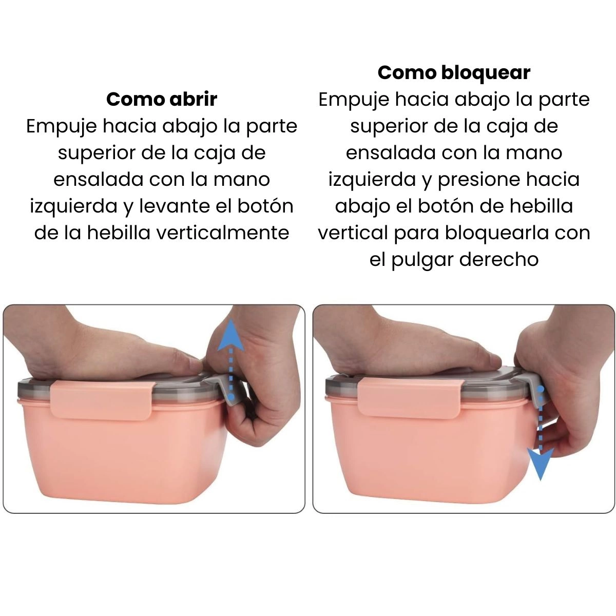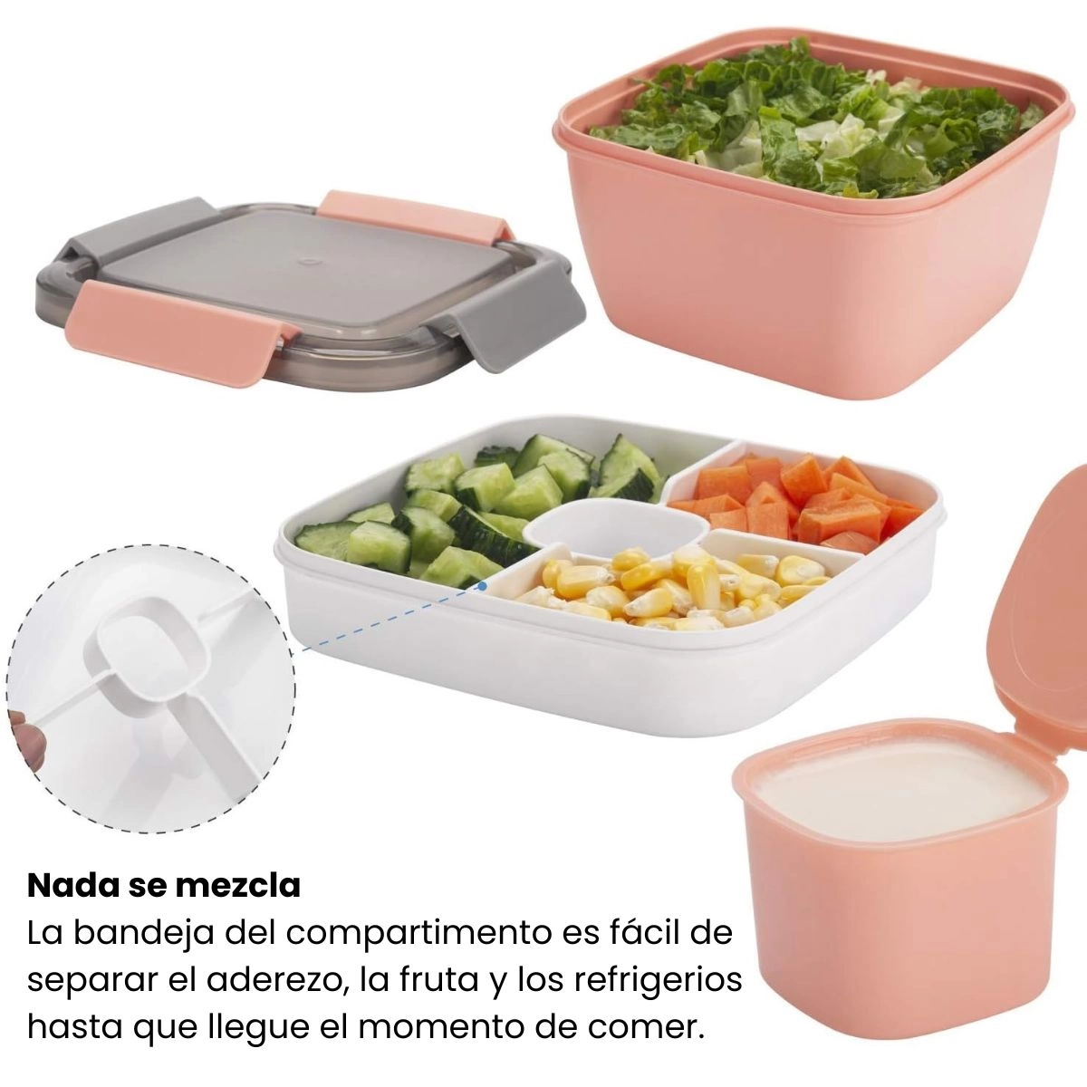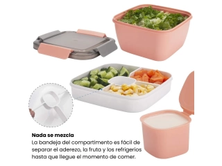 Posee una bandeja interior, devisoria con compartimientos que posee un tarrito con tapa (tarrito removible), como para una salsa.