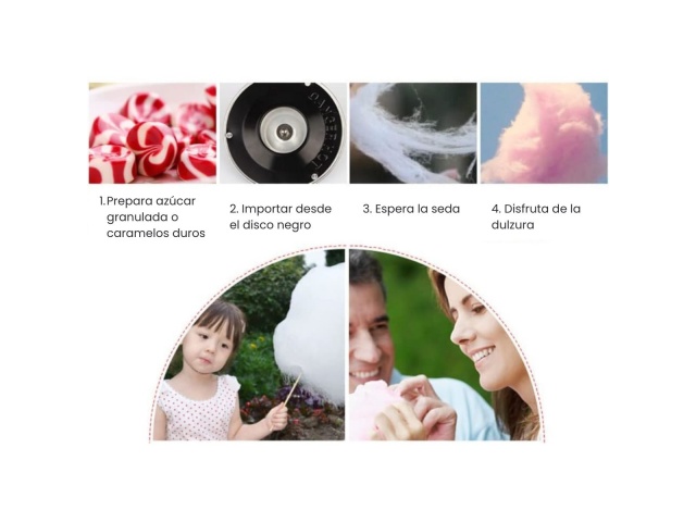 Fácil de Usar: Con un solo botón de operación, esta máquina es tan simple que incluso los niños pueden usarla. Solo conéctala, añade azúcar al recipiente central, y comienza a hacer algodón de azúcar.