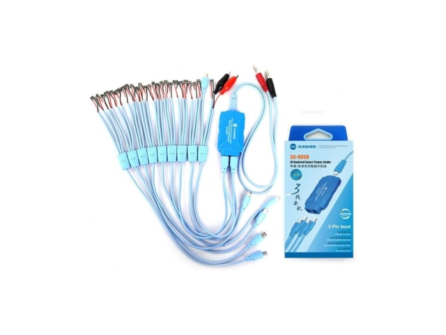 El SUNSHINE SS-905D es un cable de encendido inteligente diseñado para técnicos de reparación de celulares. Permite alimentar placas lógicas de iPhone y Android directamente desde una fuente de poder de CC, eliminando la necesidad de usar una batería física durante las pruebas. Este cable es esencial para diagnosticar si un equipo tiene un corto circuito inicial o si el problema de "no enciende" se debe a una batería dañada o a una falla en el IC de carga.